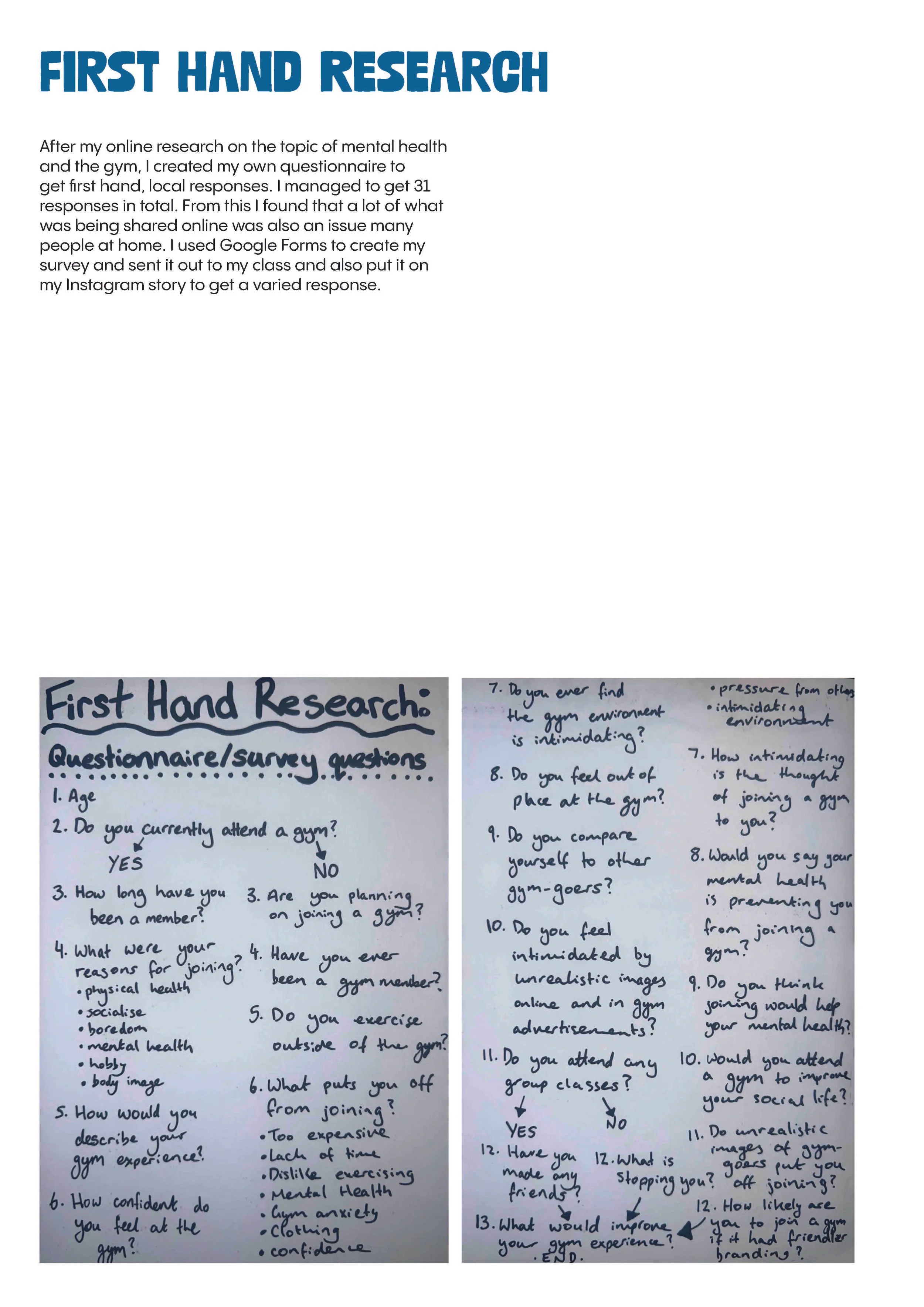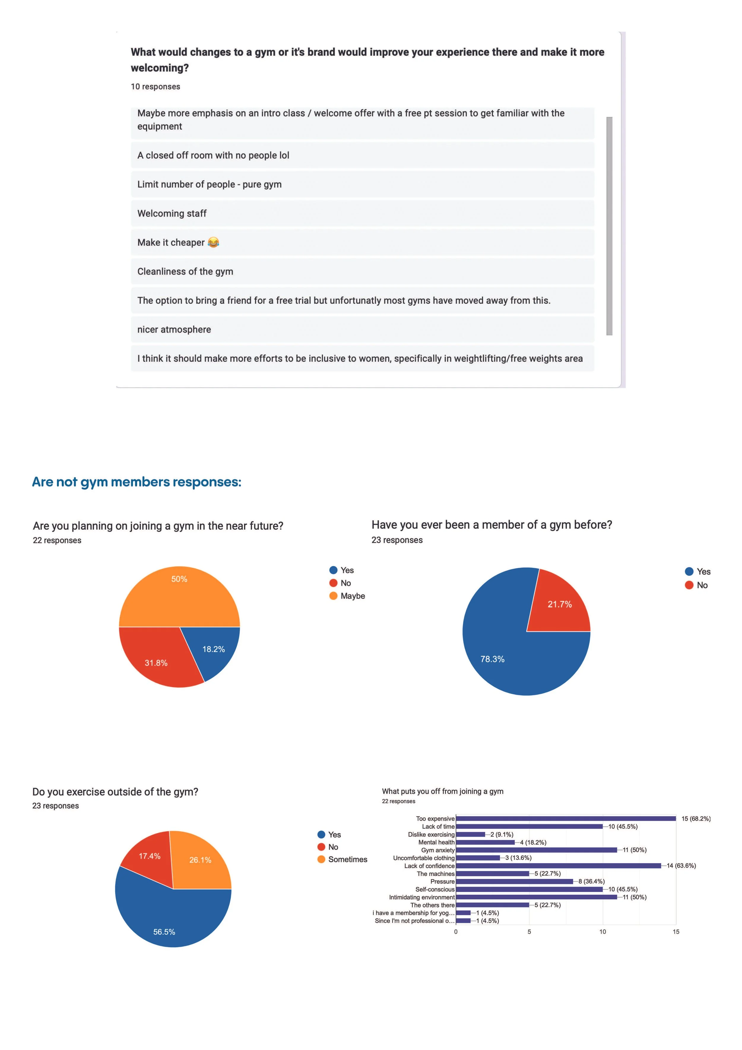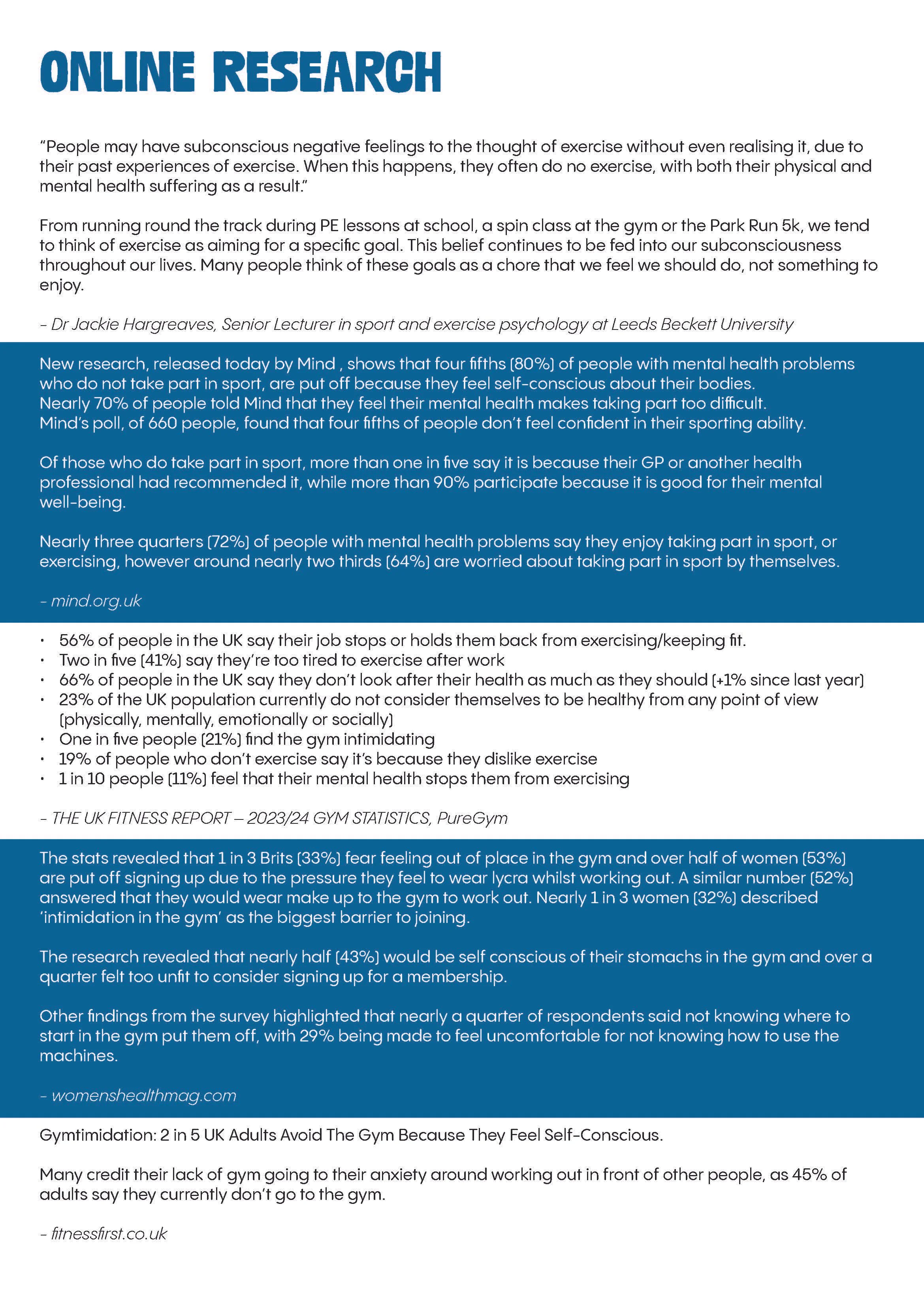 Define - From this, I discovered that 2 in 5 people avoid the gym as they feel self-conscious, and 1 in 10 people say that their mental health is preventing them from joining a gym. This shows that there is a need to create a gym for those who would usually feel out of place there and for those who struggle with their mental health. I aimed to create a gym with a fun, inclusive, and non-judgmental atmosphere so that all can feel welcome. Mental health is a priority, as well as the promotion of body positivity. I created personas for this project based off people who would be seeking a safe space to exercise.