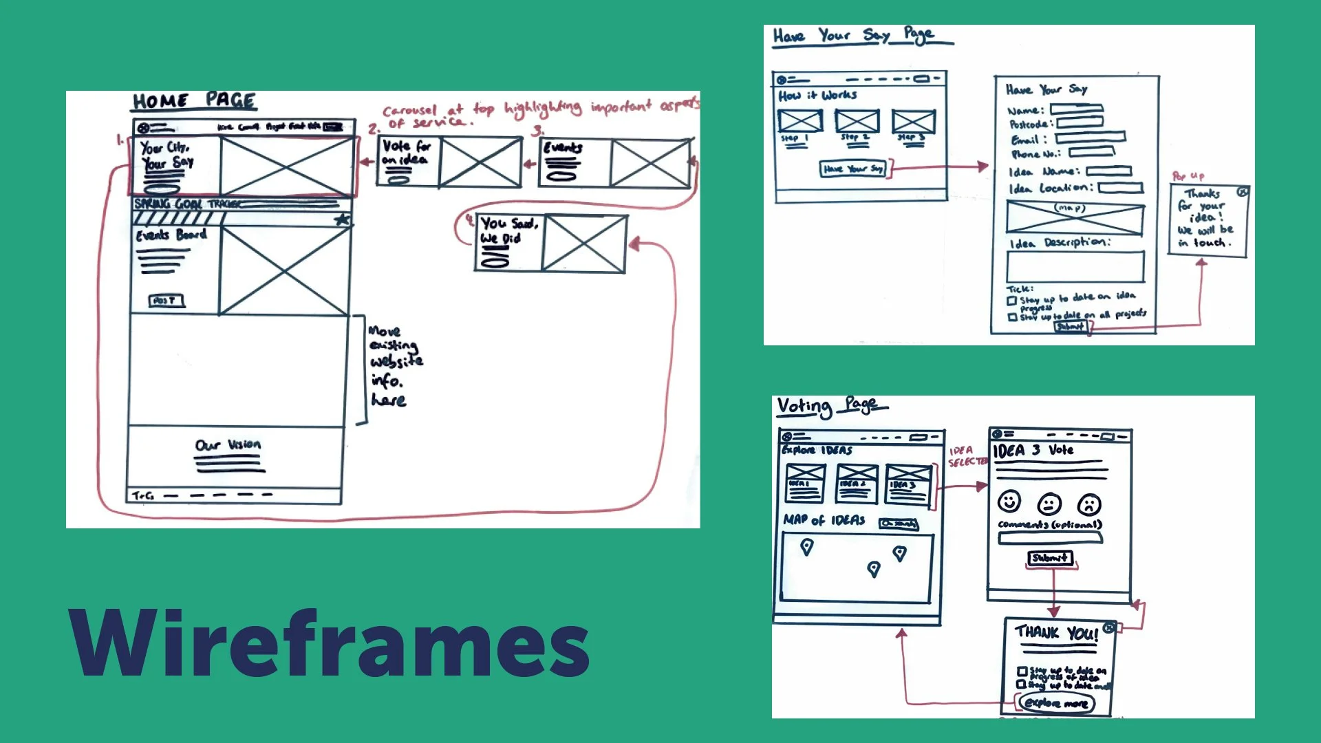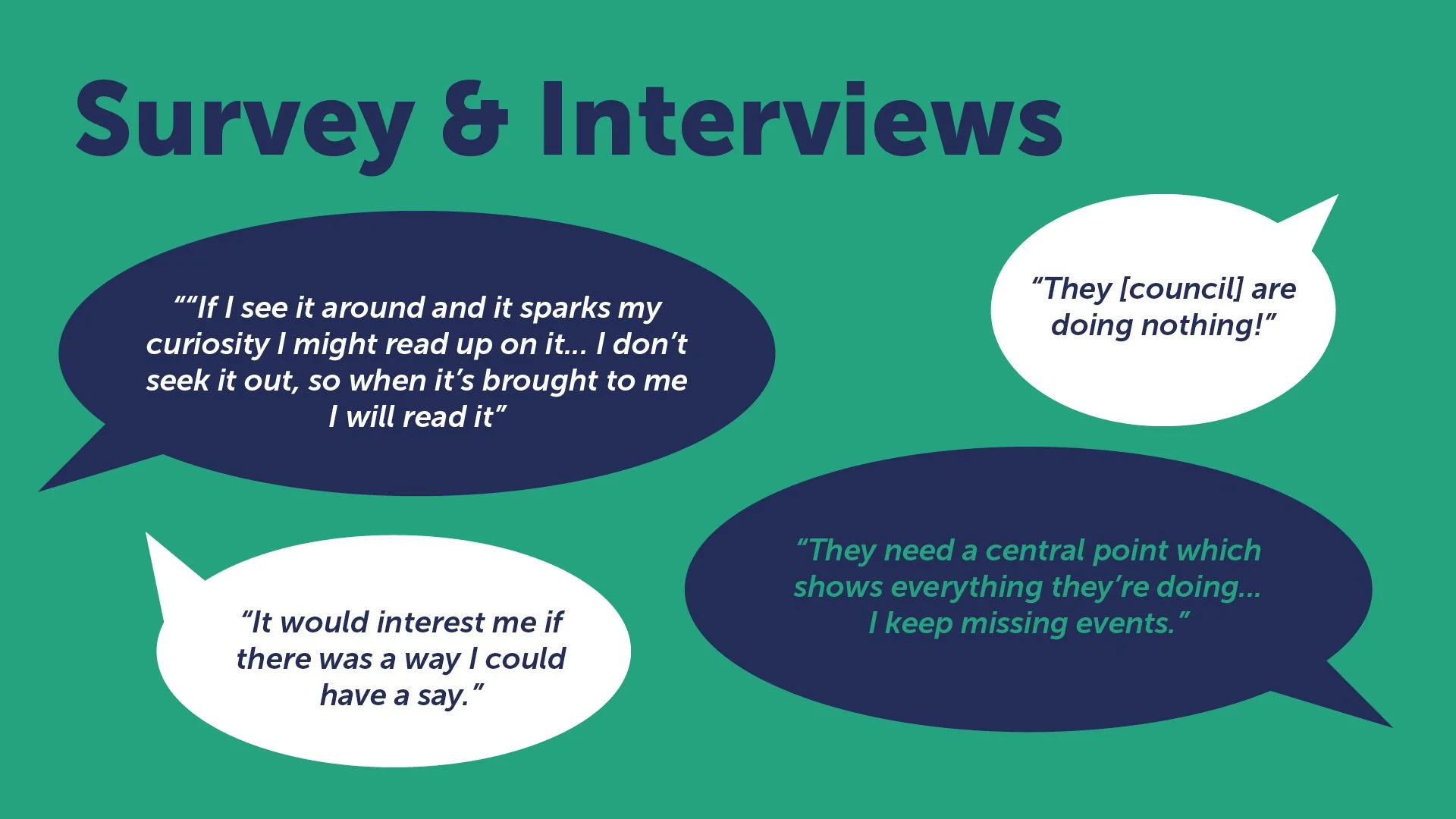 During our research, we discovered ‘Your Say’, an already established council platform. Users can explore events, initiatives, and plans that the council is endorsing. Users can provide feedback through surveys and share ideas in the "Ideas Bank." It is a platform that has great potential and, in theory, should address many of the pain points we identified through our primary research. But people are not aware of the service, and the council underutilises it. Instead of creating an entirely new service that would get lost among the numerous others, we decided to enhance this existing idea.