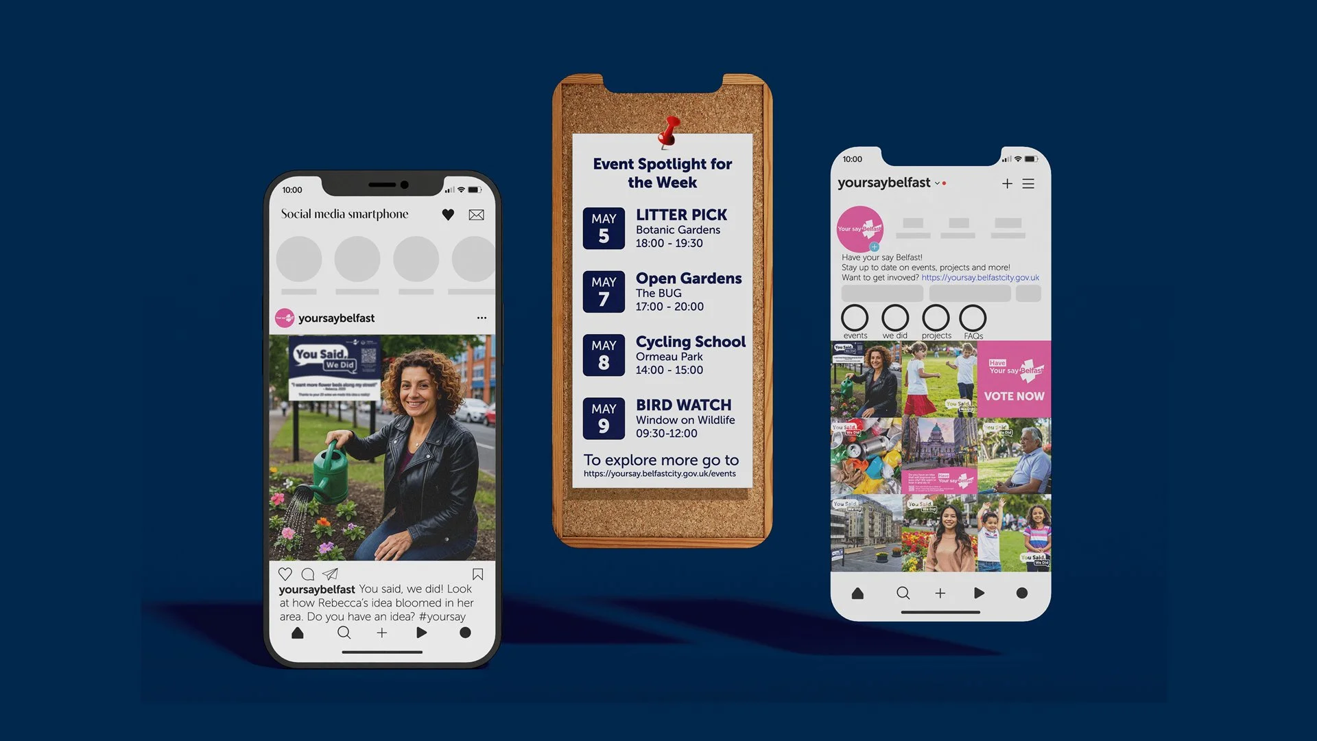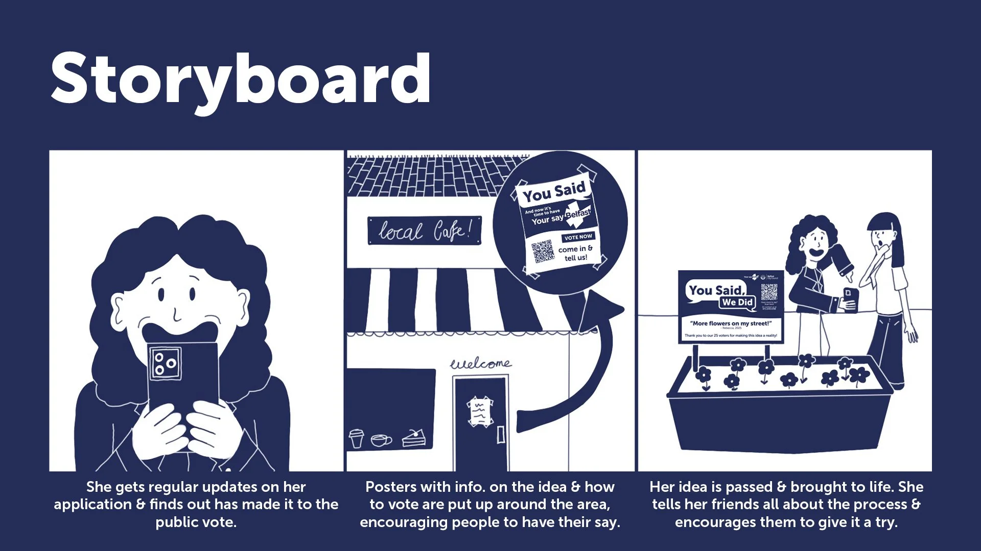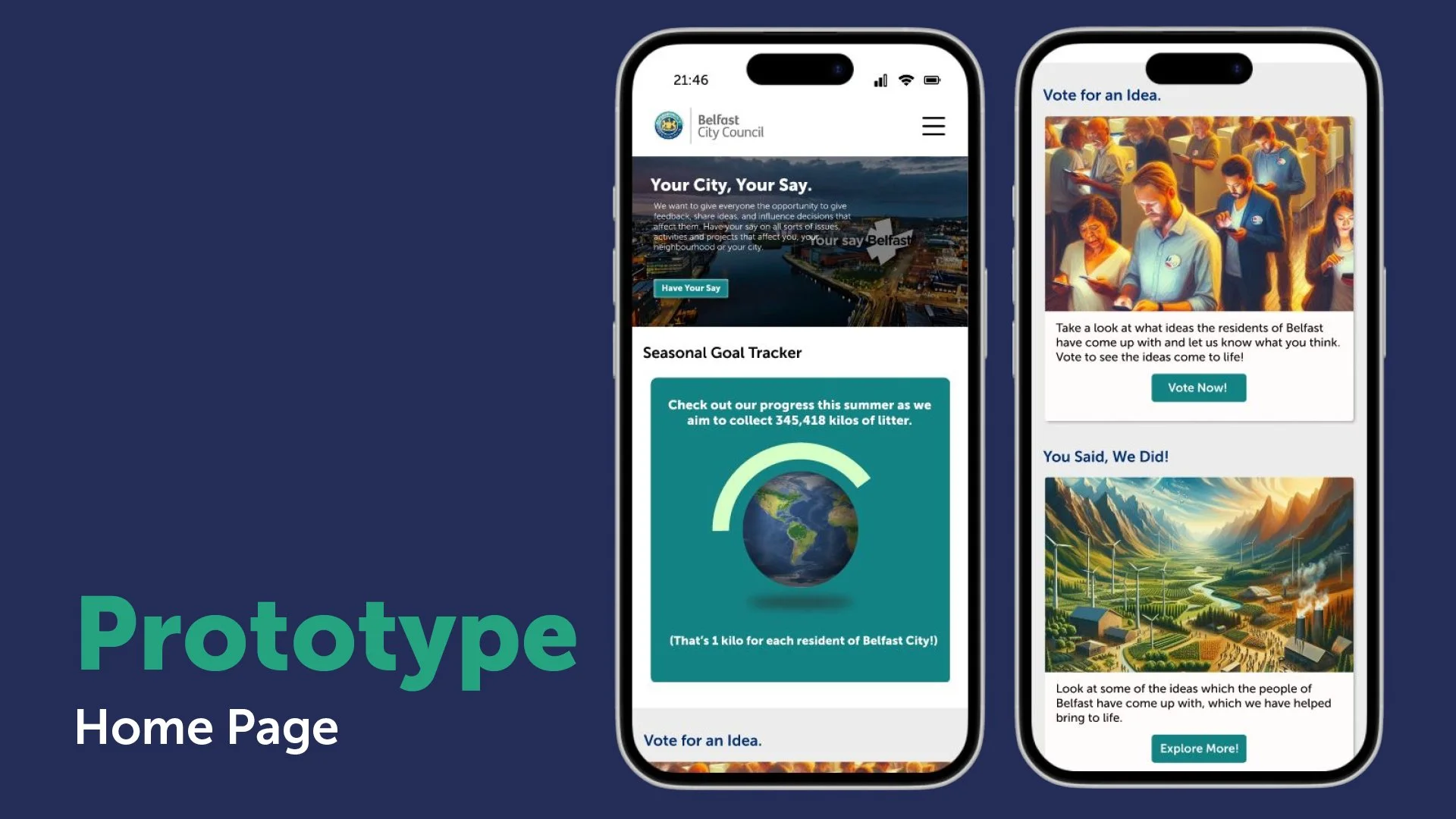The solution was to reimagine the existing platform, ‘Your Say’, to grow engagement with Belfast residents and improve relations between the council and communities. This will be achieved through a feedback loop of ‘You Said, We Did’, focusing not only on gathering feedback but also on promoting ongoing projects, local sustainability events, and volunteering sessions. Then, we can reach marginalised voices through physical feedback elements, such as partnering with Belfast Stories, cafés, and institutions.