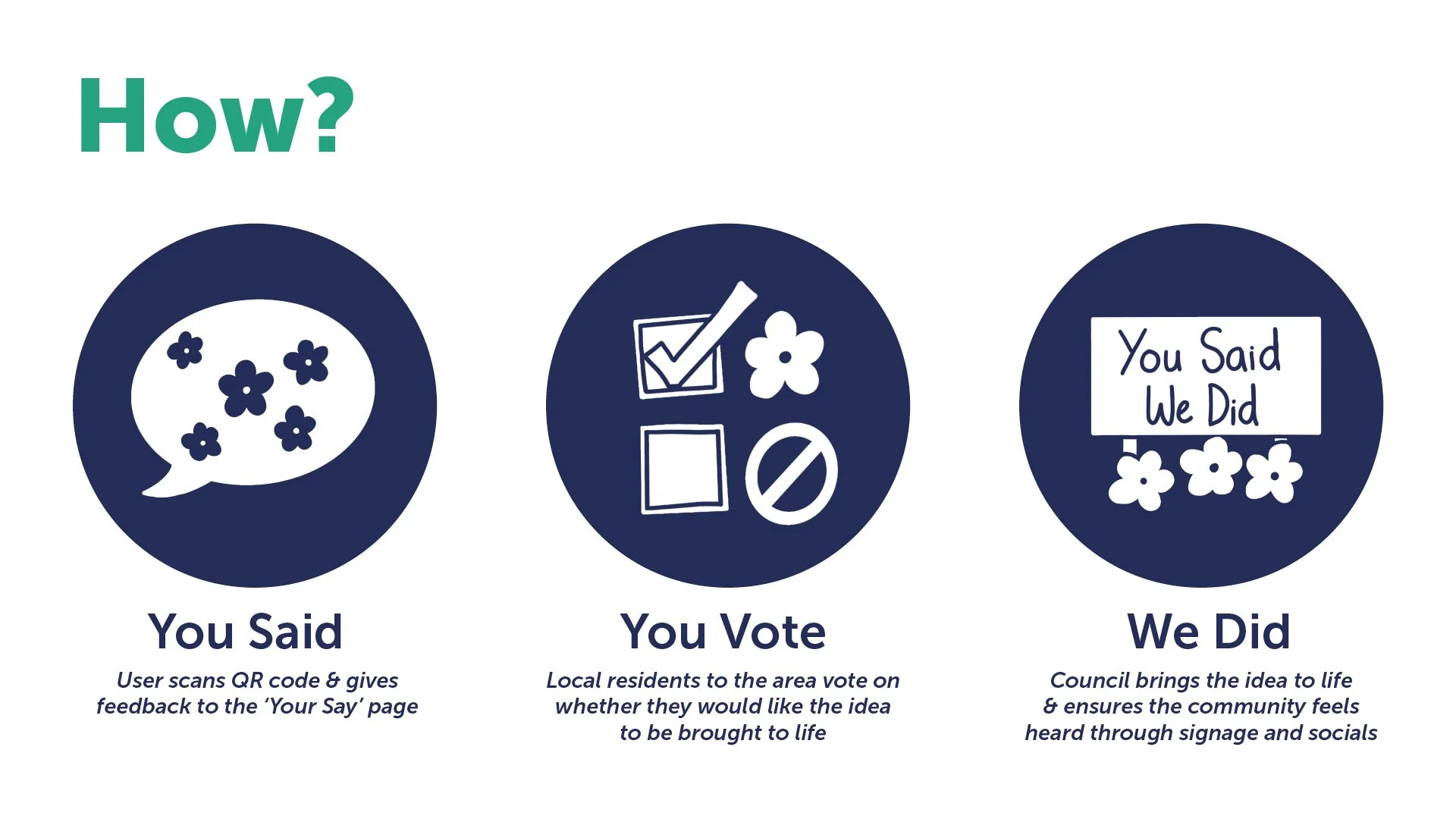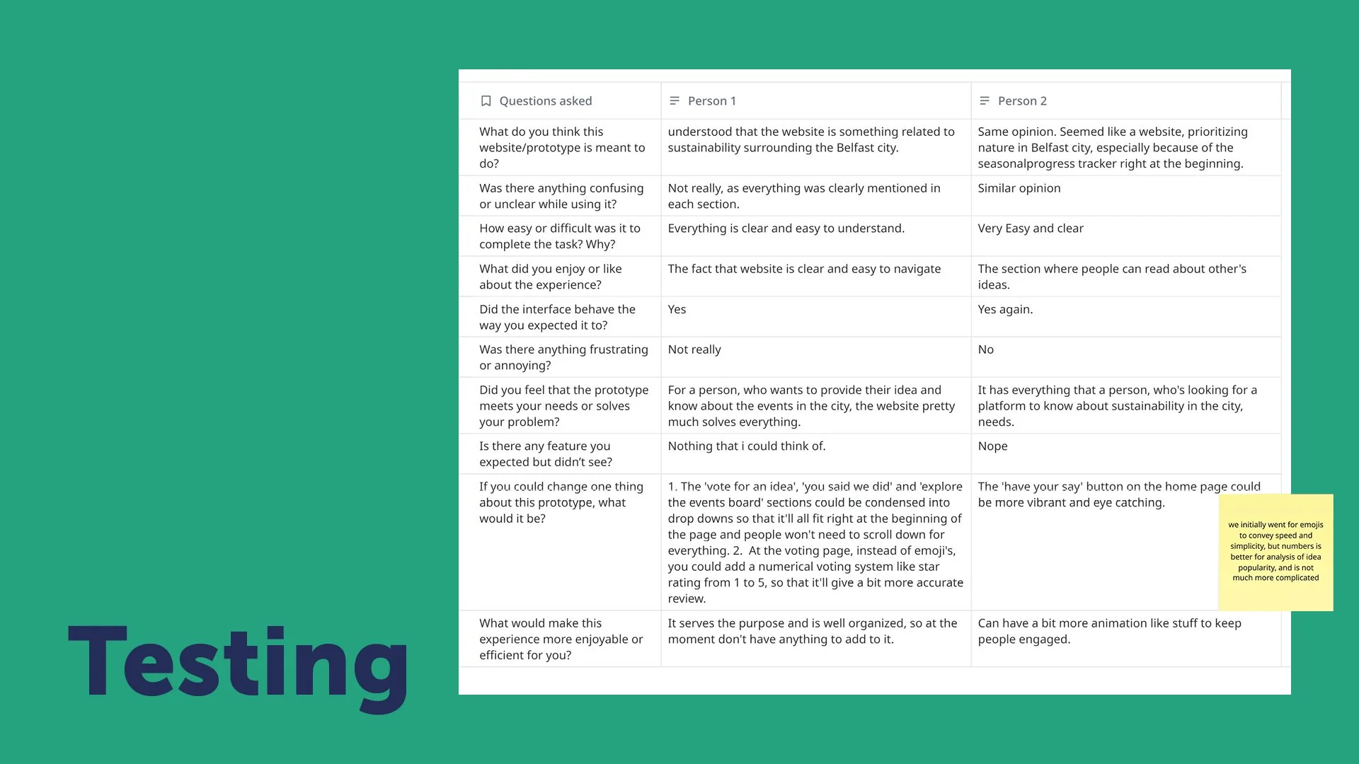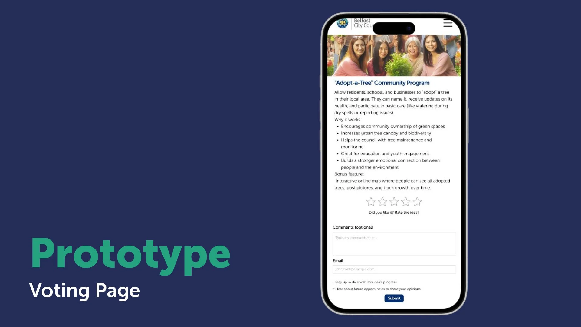 The solution was to reimagine the existing platform, ‘Your Say’, to grow engagement with Belfast residents and improve relations between the council and communities. This will be achieved through a feedback loop of ‘You Said, We Did’, focusing not only on gathering feedback but also on promoting ongoing projects, local sustainability events, and volunteering sessions. Then, we can reach marginalised voices through physical feedback elements, such as partnering with Belfast Stories, cafés, and institutions.