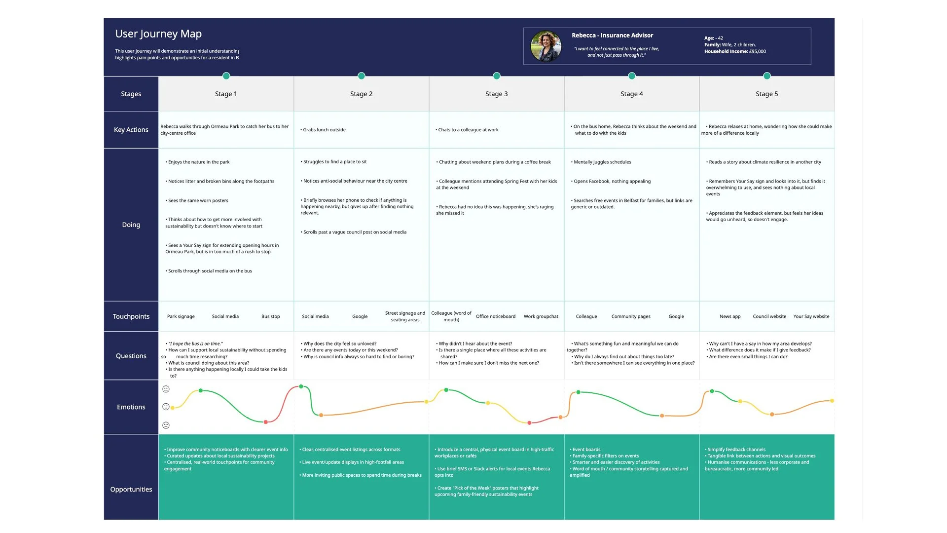 We created a persona, a user journey map, empathy map, and explored stakeholders. The key stakeholders were the residents of Belfast and the City Council.